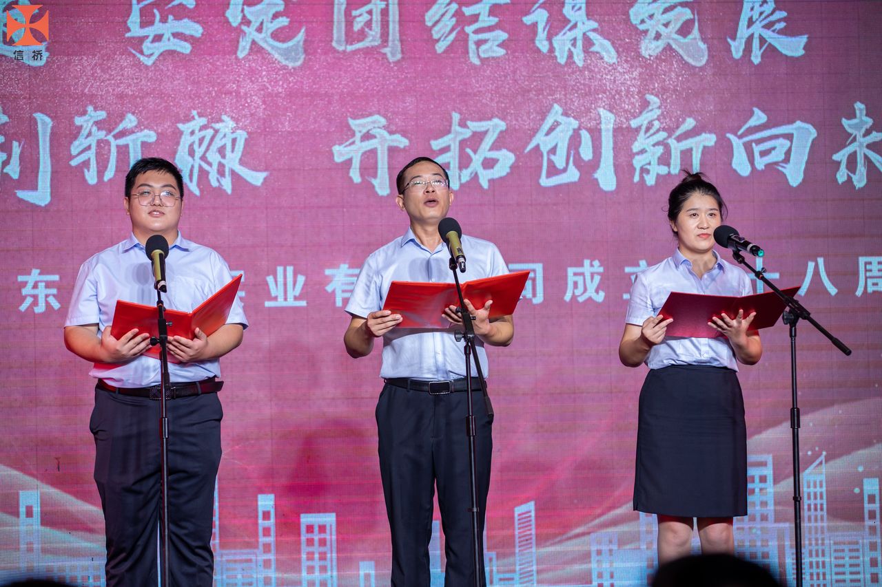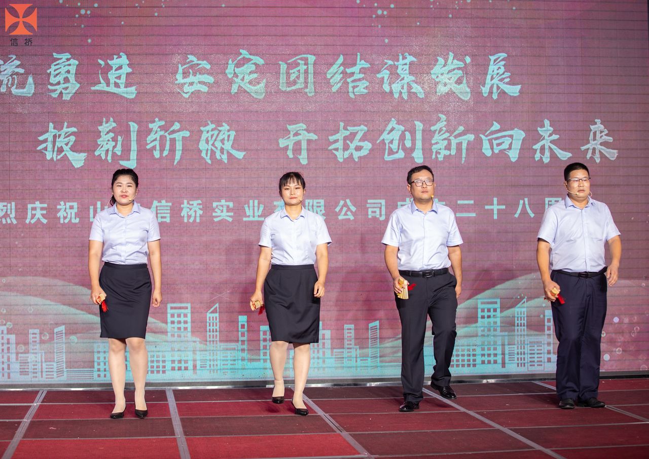 歲月如歌,風(fēng)霜如畫(huà),二十八年彈指一揮間,山東信橋?qū)崢I(yè)有限公司(以下簡(jiǎn)稱(chēng)山東信橋)迎來(lái)了二十八周歲的生日。二十八年來(lái),信橋人在激烈的市場(chǎng)競(jìng)爭(zhēng)中奮力拼搏、砥礪前行,接受了市場(chǎng)風(fēng)風(fēng)雨雨的洗禮,取得了累累碩果。為了慶祝這一特殊的日子,2022年8月8日,以“激流勇進(jìn),安定團(tuán)結(jié)謀發(fā)展 披荊斬棘,開(kāi)拓創(chuàng)新向未來(lái)”為主題的山東信橋二十八周年慶典活動(dòng)在寶盛大酒店舉行。